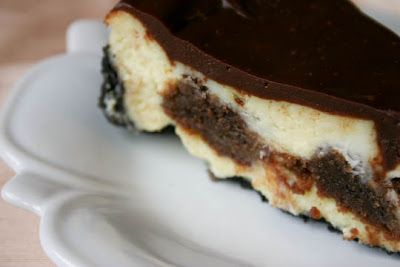 So it's probably a dangerous thing that I know how to make one now. A cheesecake, that is, not a wedding cake. Especially this cheesecake. This was rich and over-the-top with squares of fudgy, chocolatey brownies mixed into the batter and an addicting Oreo crust that I could have seriously eaten by itself if that sort of thing were socially acceptable. And the ganache over the top was perfect, especially since mine developed a giant fault line down the middle somewhere between coming out of the oven and cooling. Not only did the ganache cover it up, but it seeped into the cheesecake in parts and was super delicious.